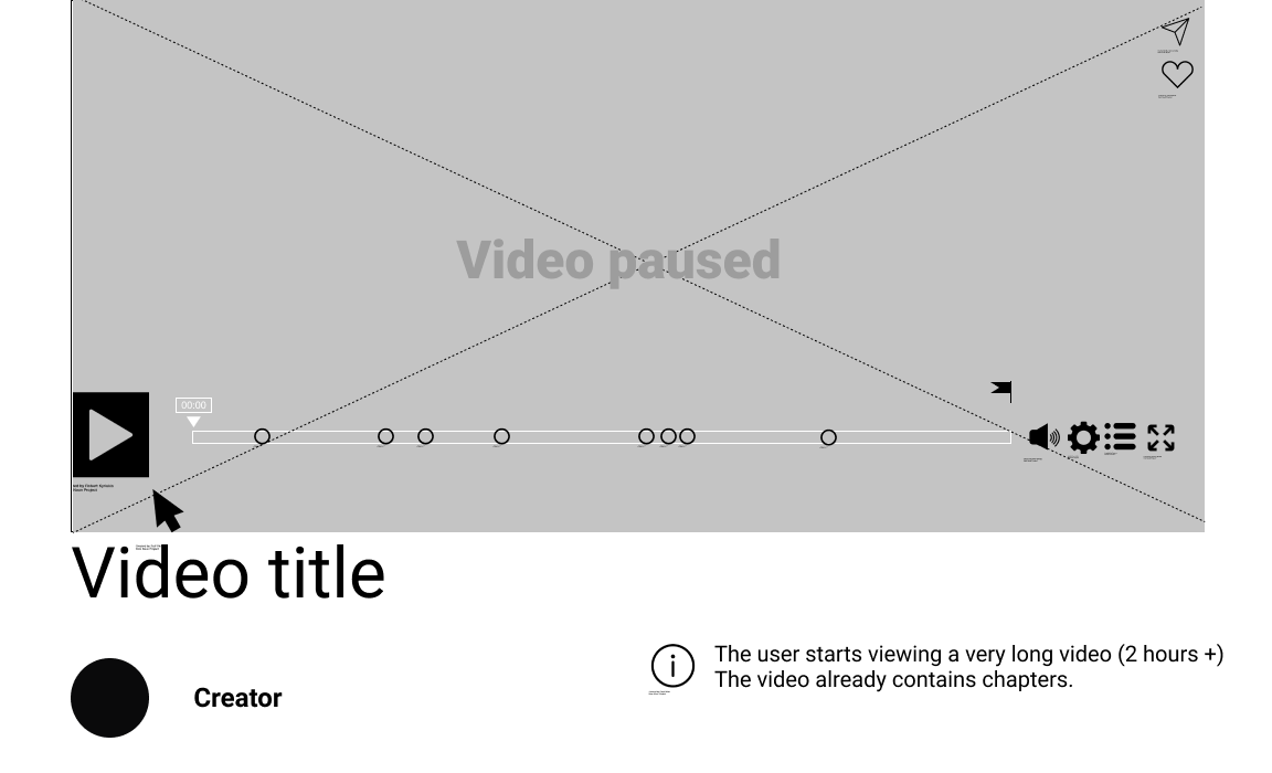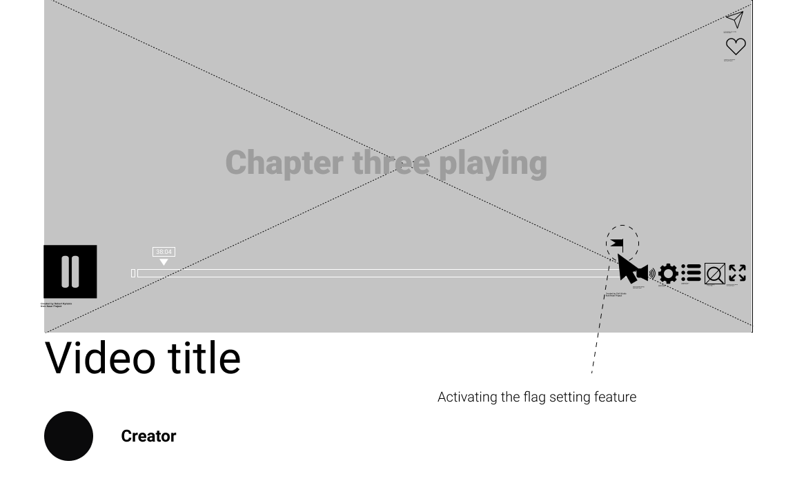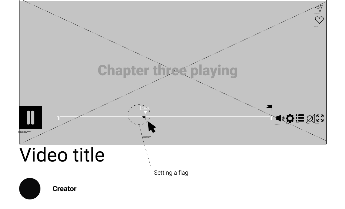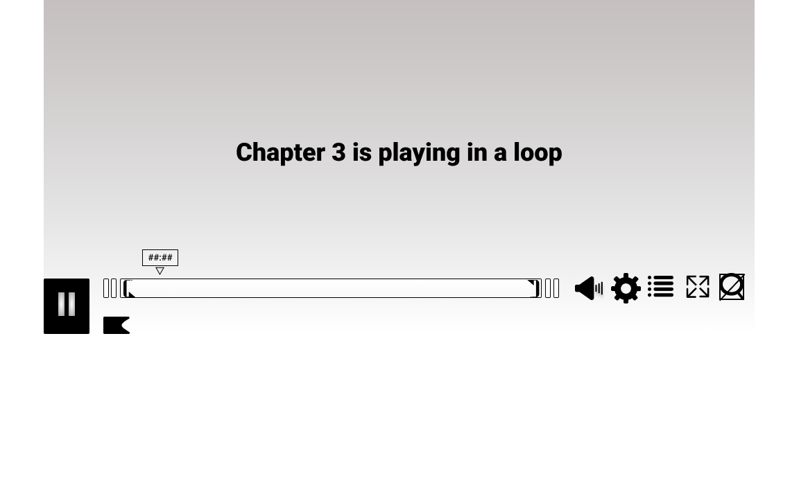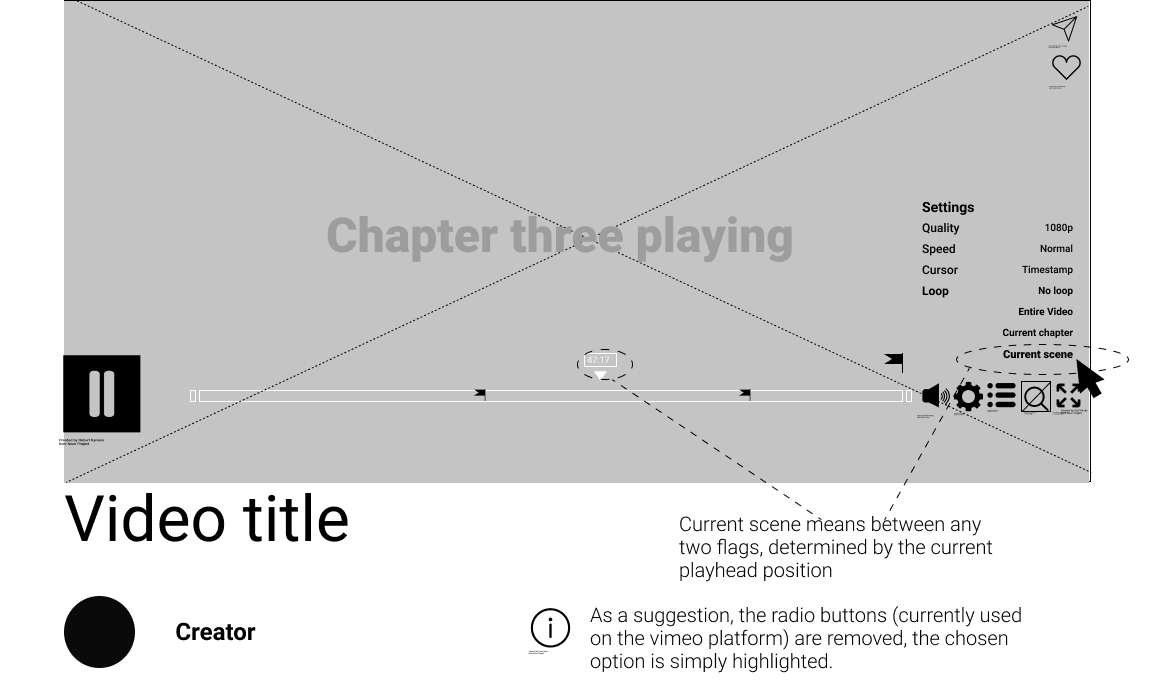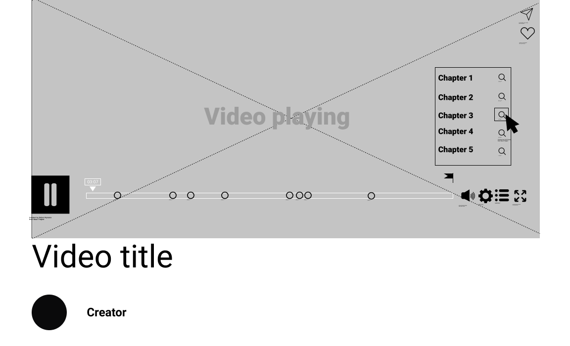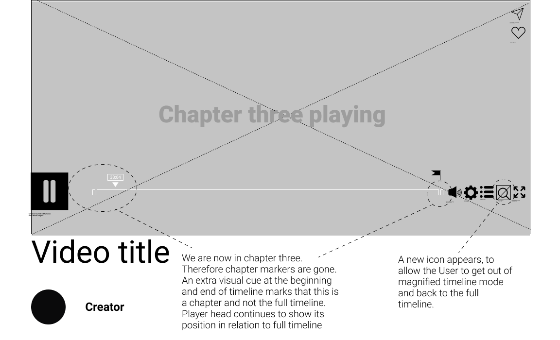 Inspired by google, and the design of its logo on search result pages, the magnified view of a single chapter’s timeline was designed to indicate where the User currently is, within the full length video. The number of “broken timeline pieces” indicates how many chapters are ahead or behind. The timeline (both full and magnified) is intentionally made taller to accomodate for flags, chapter- and loop icons. In this view, the chapter markers are gone, since the User is viewing a single chapter.
