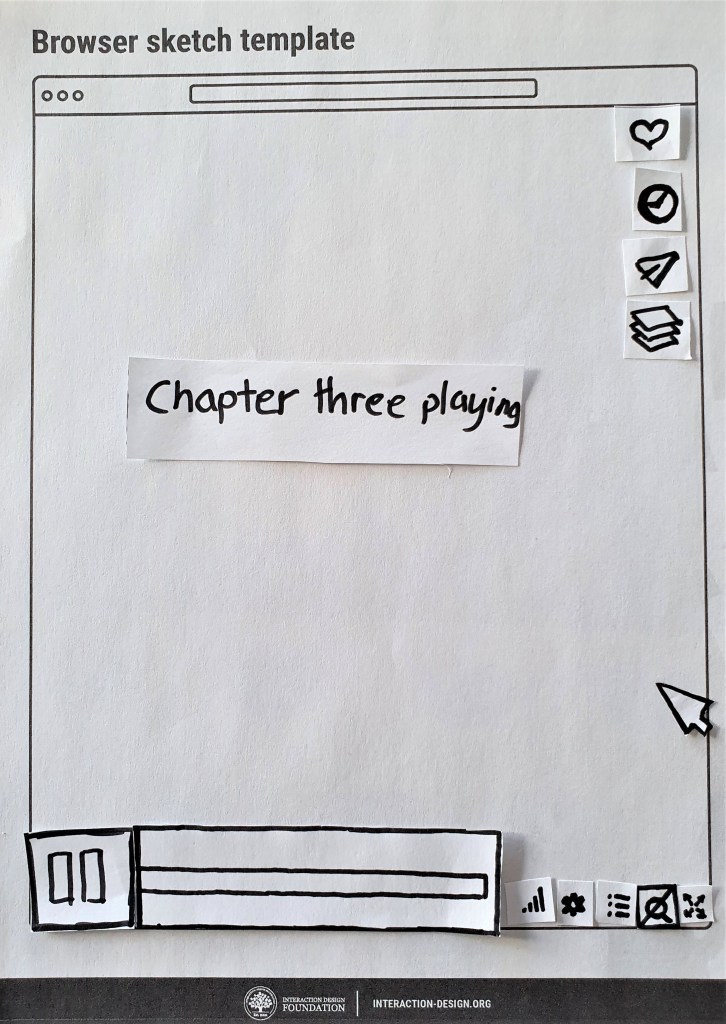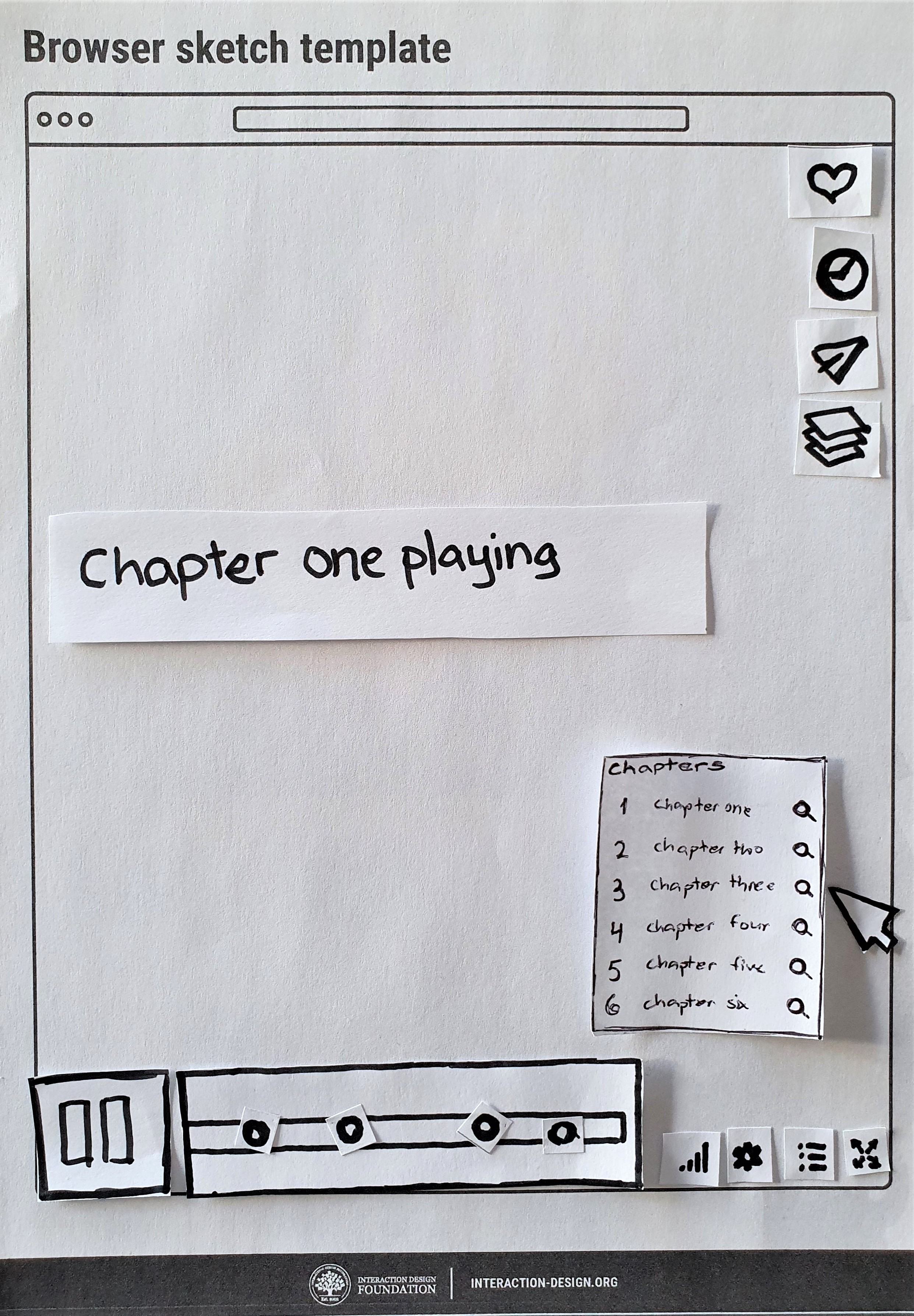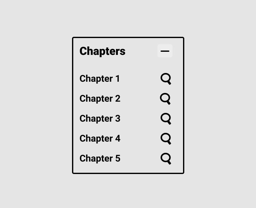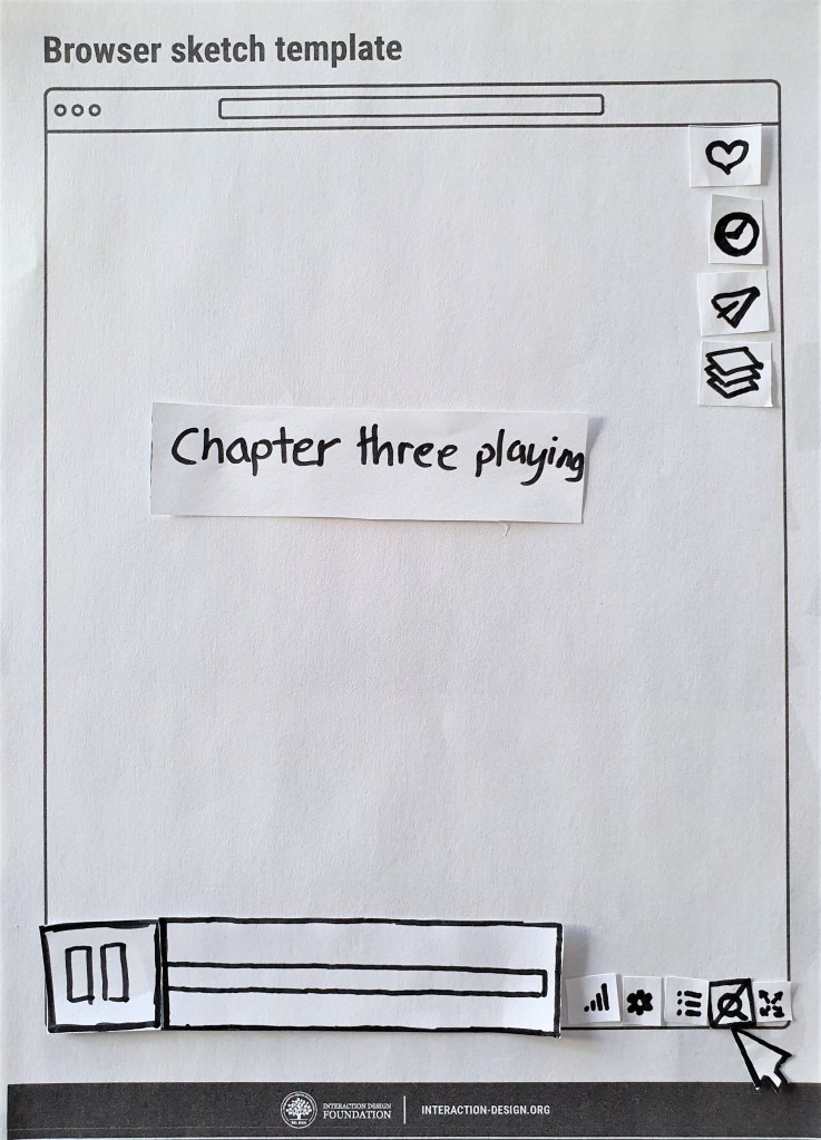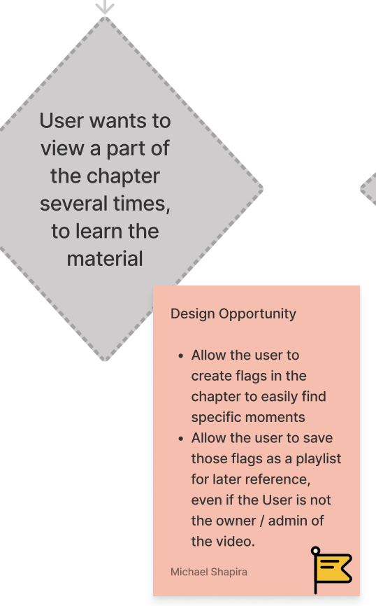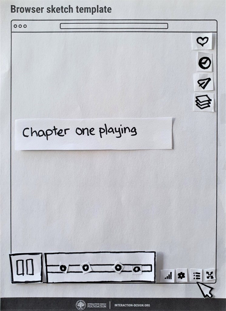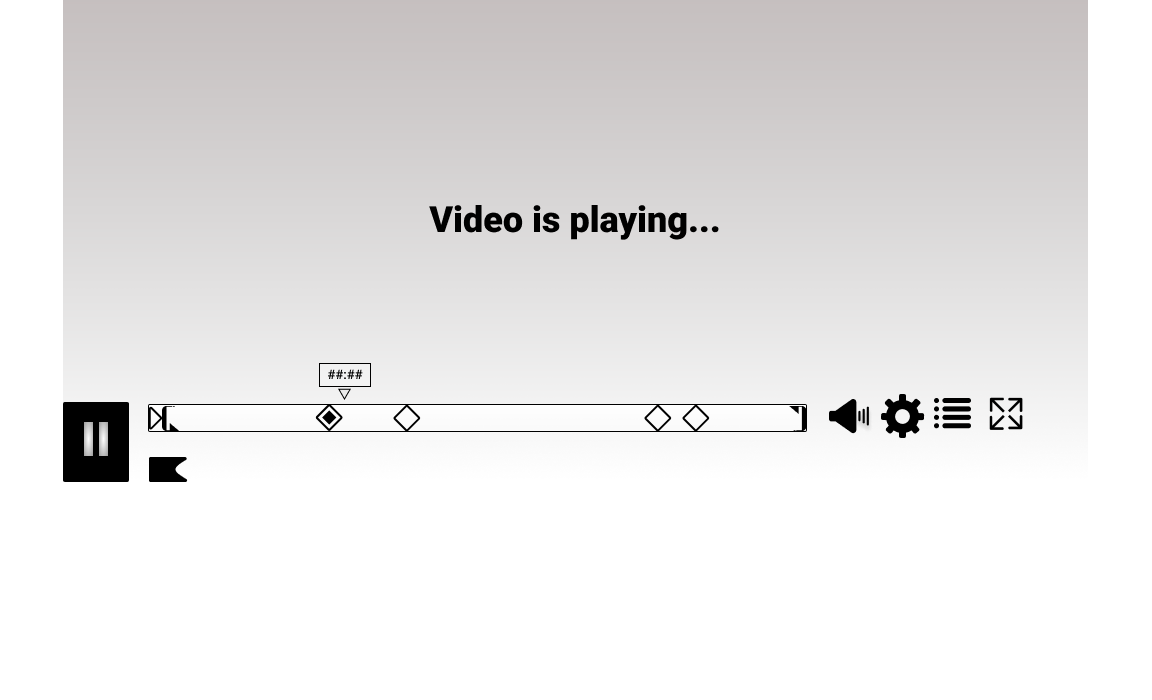 Inspired by google, and the design of its logo on search result pages, the magnified view of a single chapter’s timeline was designed to indicate where the User currently is, within the full length video. The number of “broken timeline pieces” indicates how many chapters are ahead or behind. The timeline (both full and magnified) is intentionally made taller to accomodate for flags, chapter- and loop icons. In this view, the chapter markers are gone, since the User is viewing a single chapter.