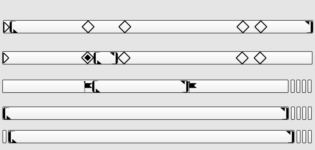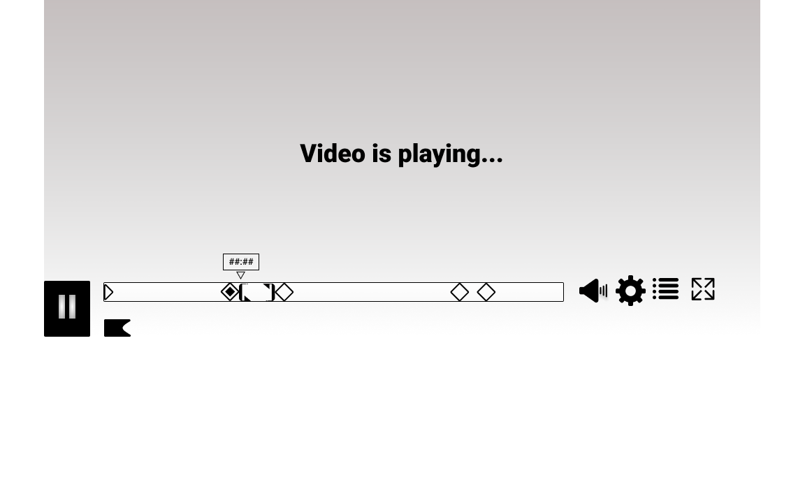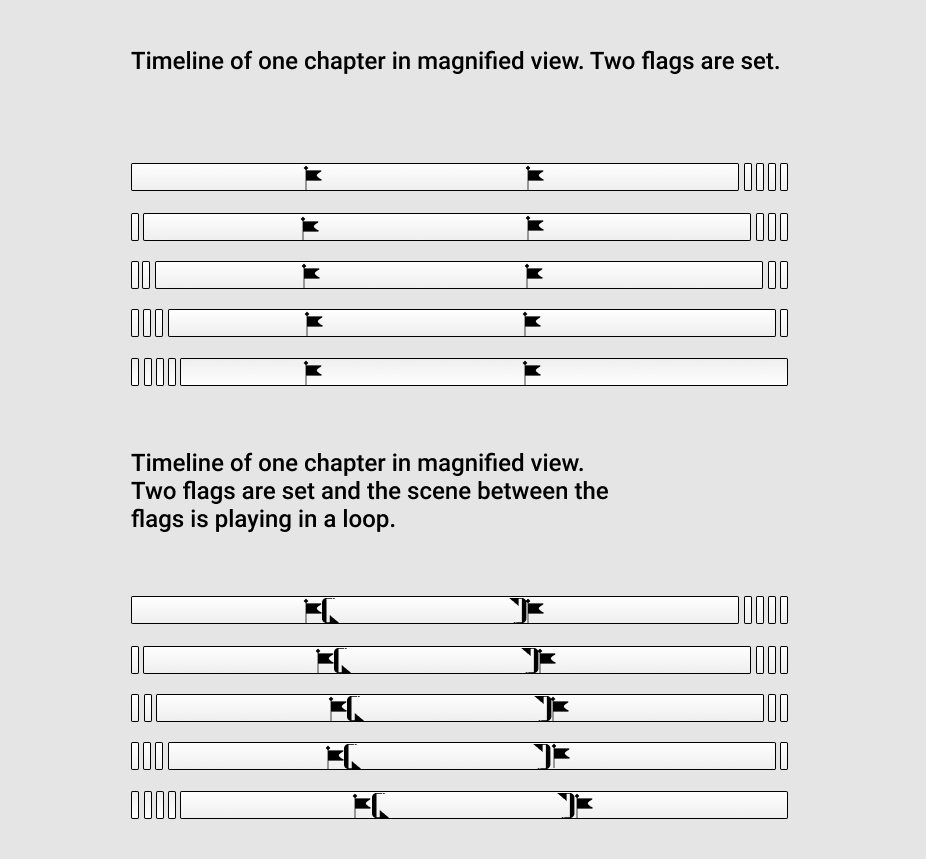 The UI Pattern Library covers examples of “magnified” timelines of 5 chapters, with one flag set, with two flags set, and with looped playback of the scene between the two flags.