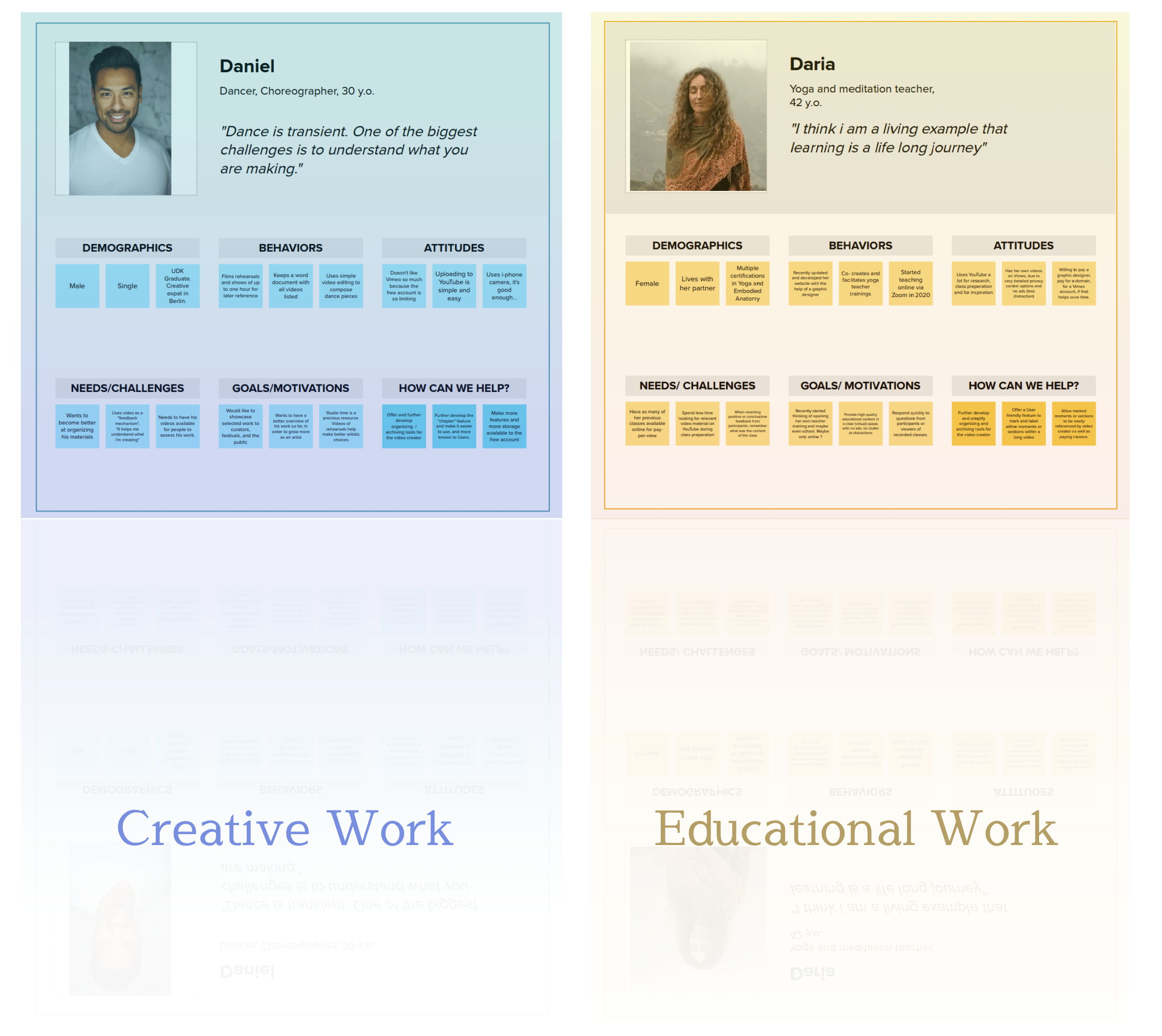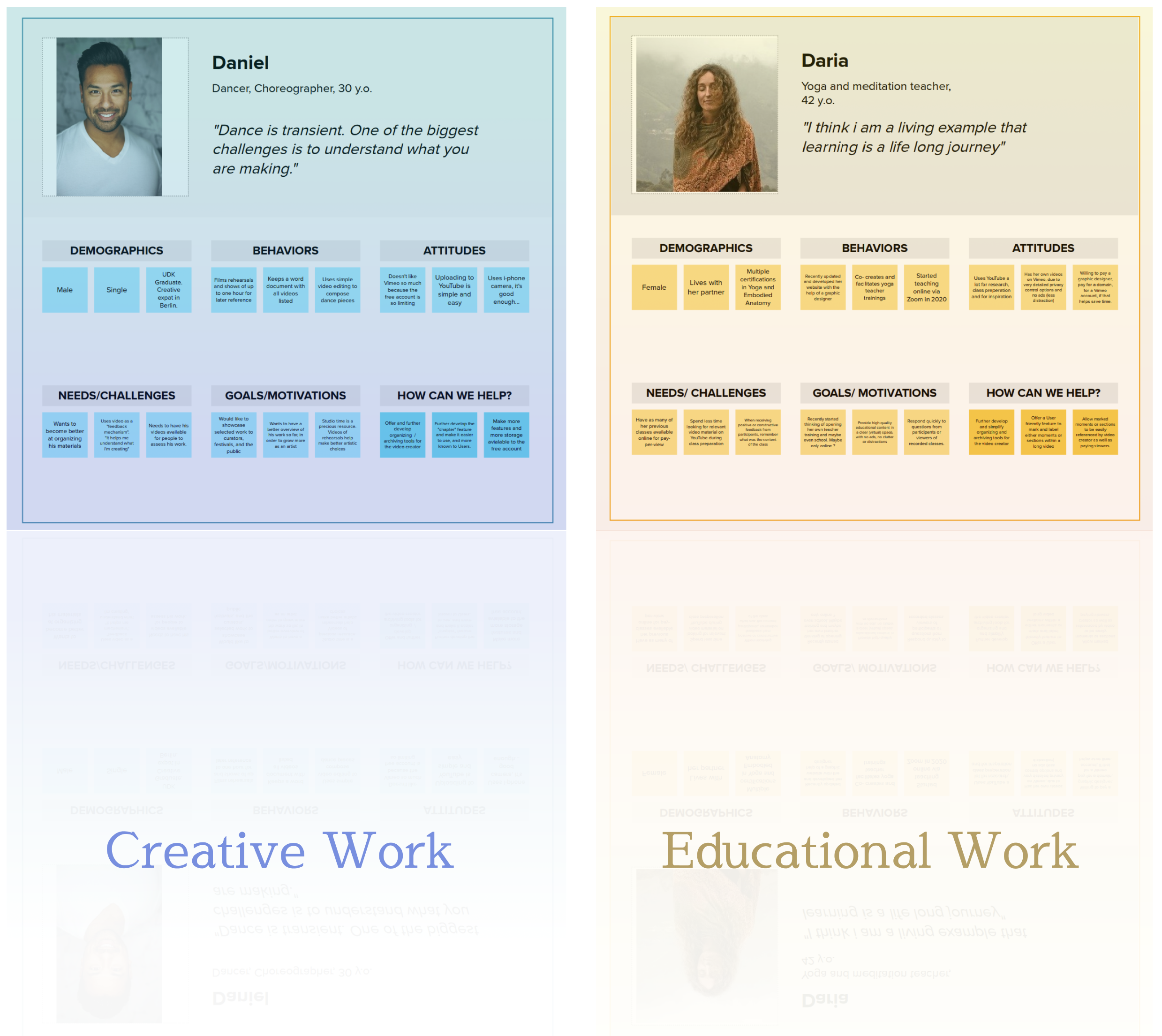 - Strategy: User Research, Personas, Journey Maps, POV and HMW.