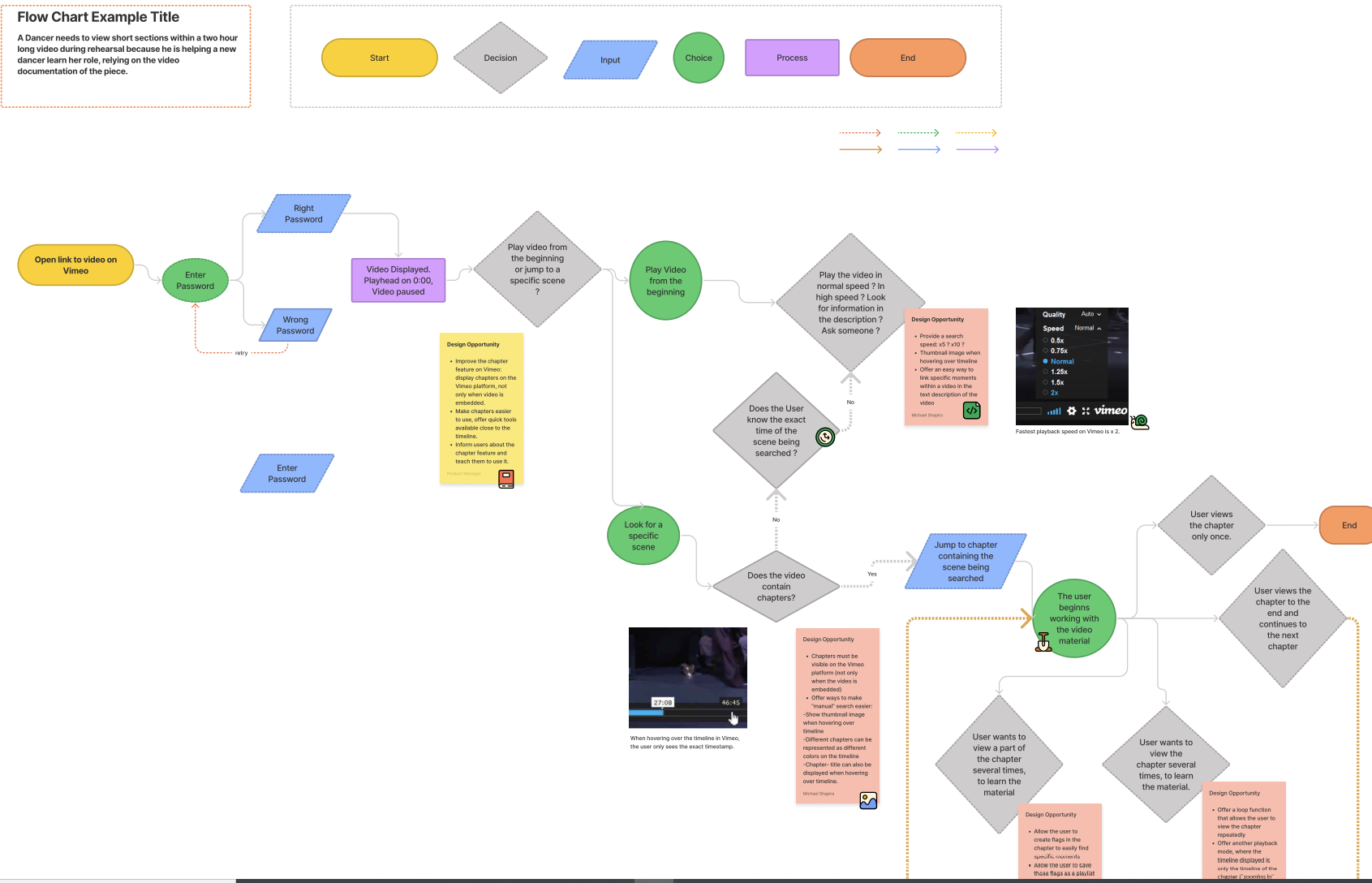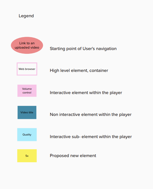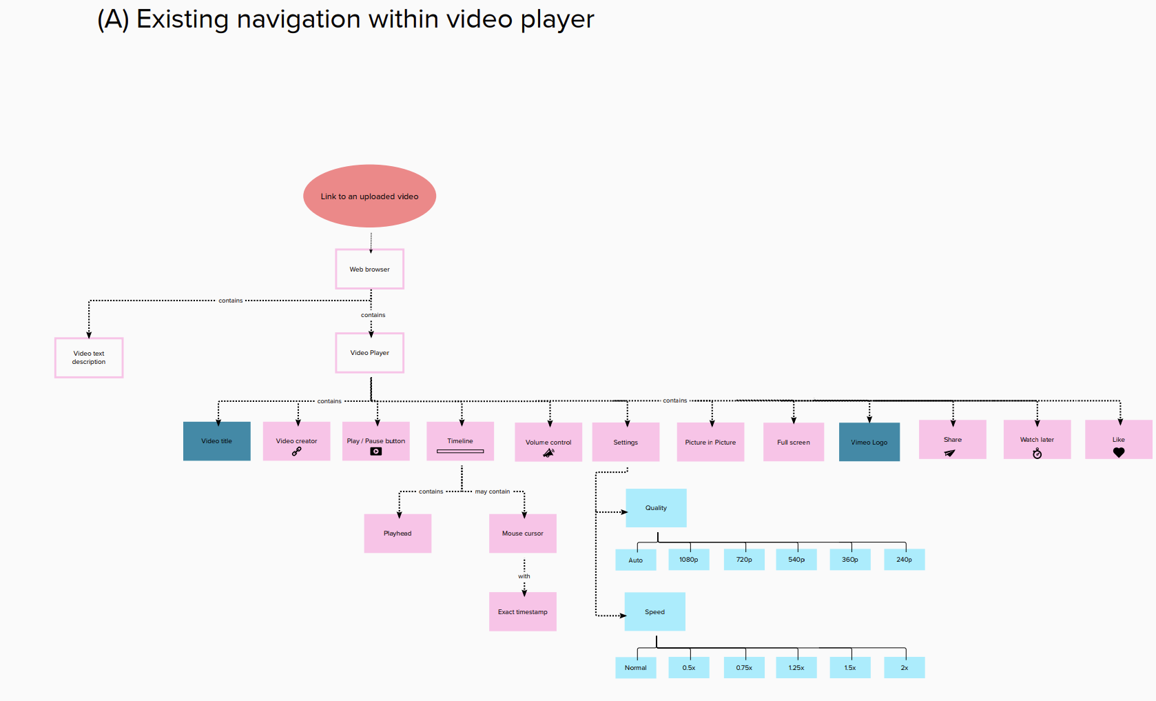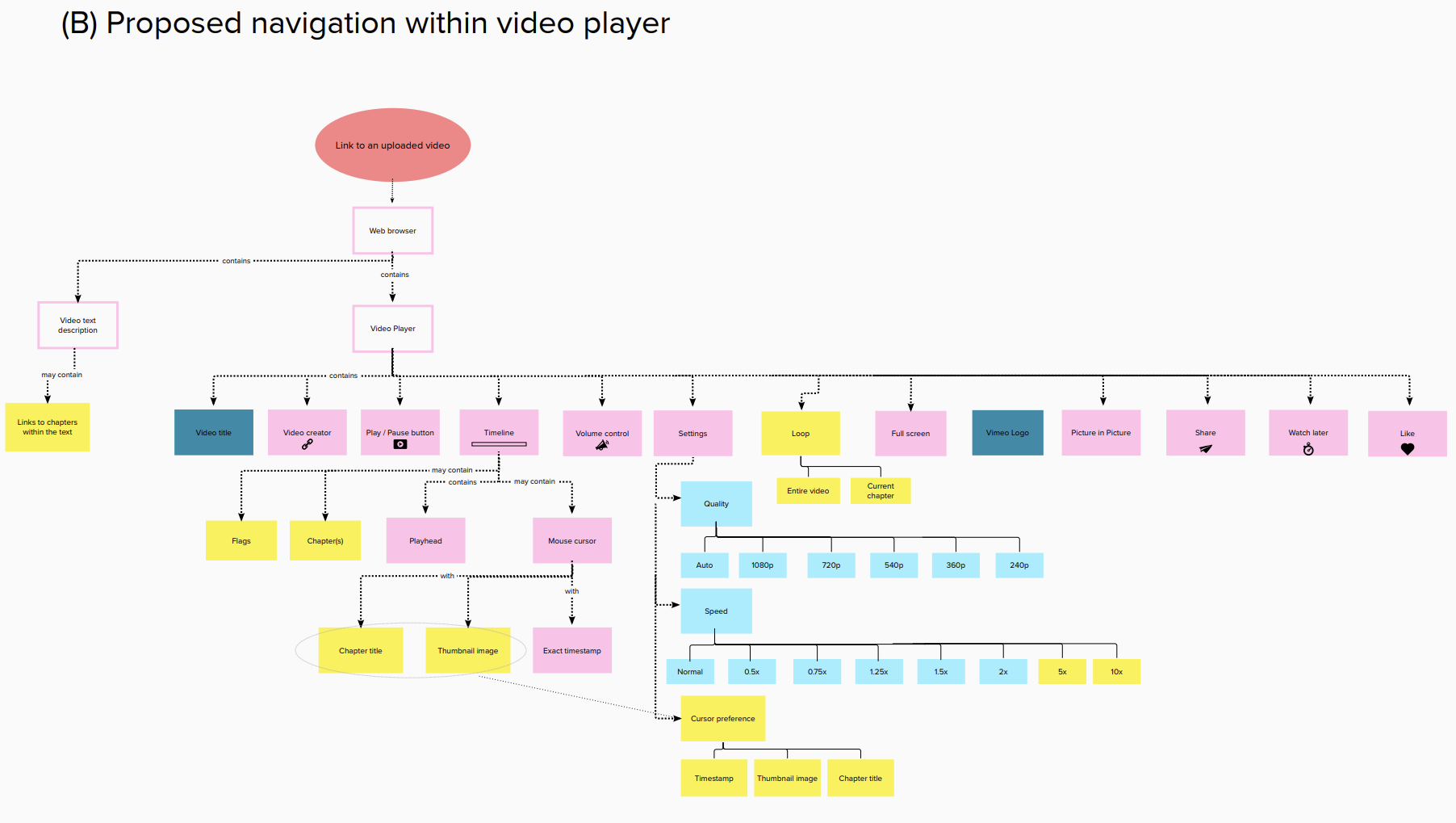 The Information Architecture was meant to show the Vimeo video player itself, not the entire Vimeo webpage. Based on the IA of the existing video player (A), a second IA diagram was made (B) describing how some design opportunities could be implemented into the player’s architecture..