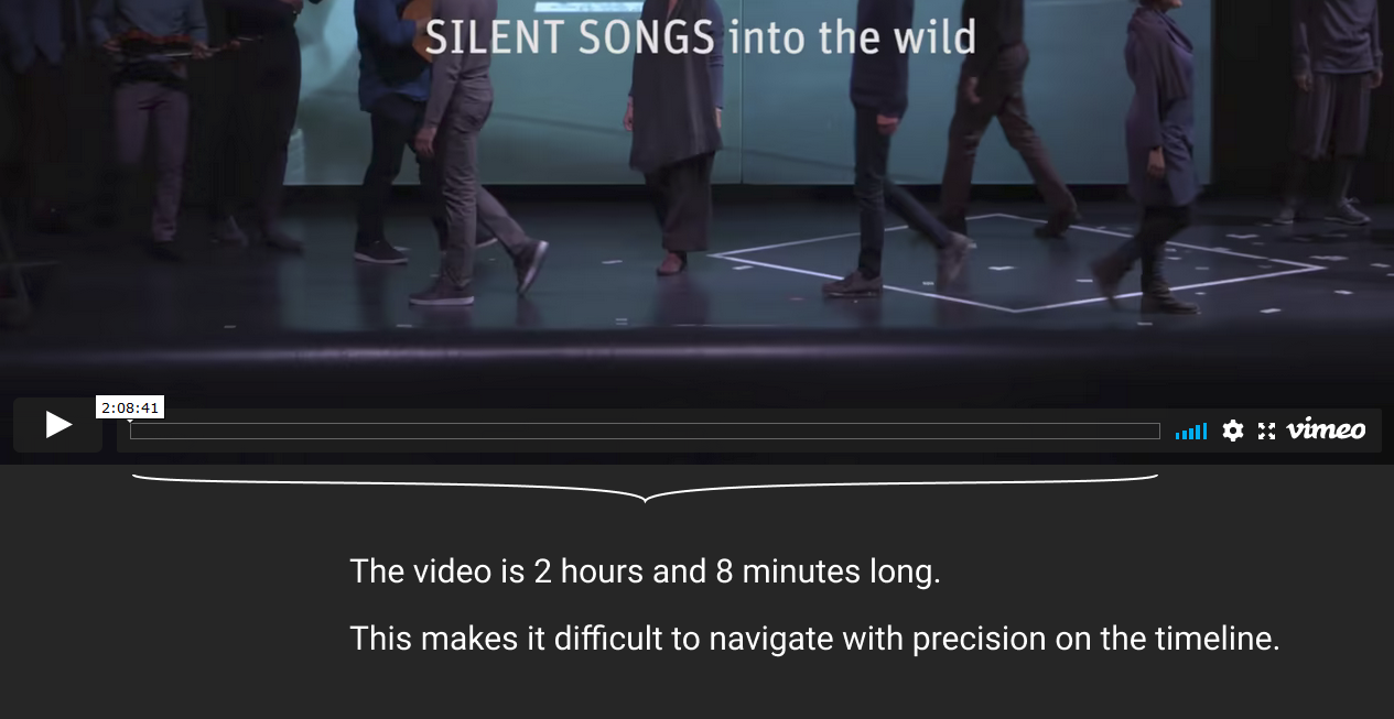I encountered the problem in my work as a performer. While in rehearsal with my colleagues, having a full-length video documentation on Vimeo of our show, we found it difficult to try to navigate with precision on the timeline of the video.