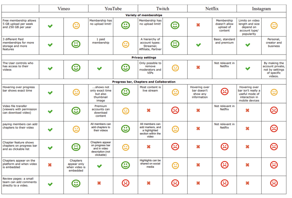 Shown here is a feature comparison using YouTube, Twitch, Netflix and Instagram as a means to better understand what makes Vimeo’s offer different from others. The feature comparison revealed differences in: